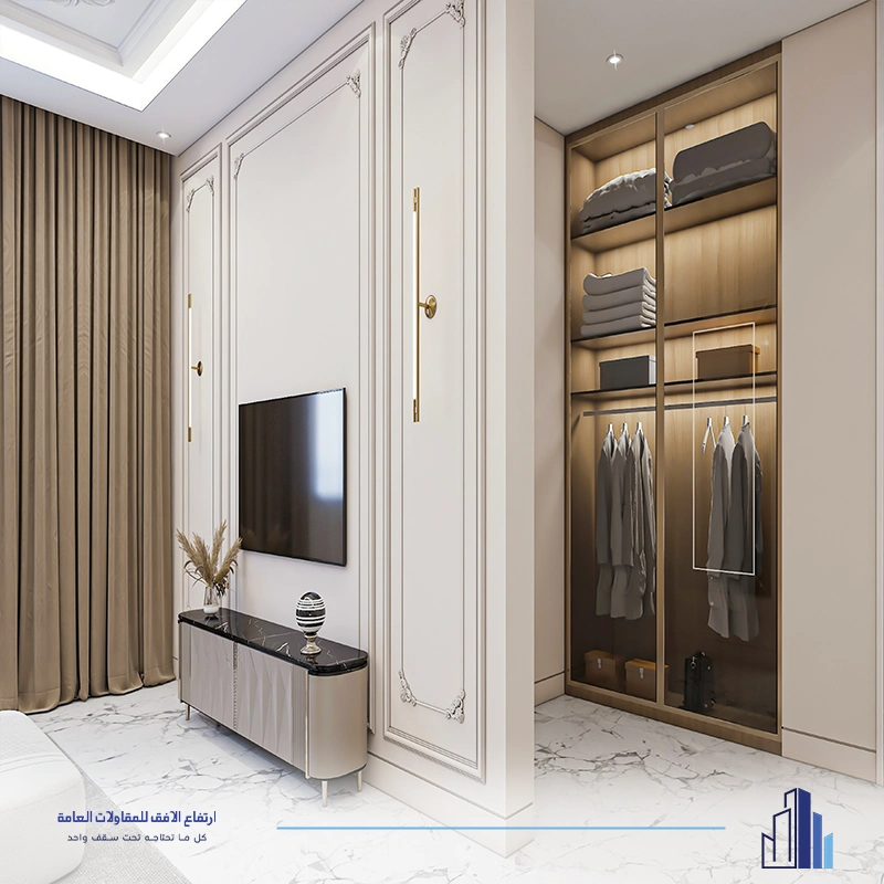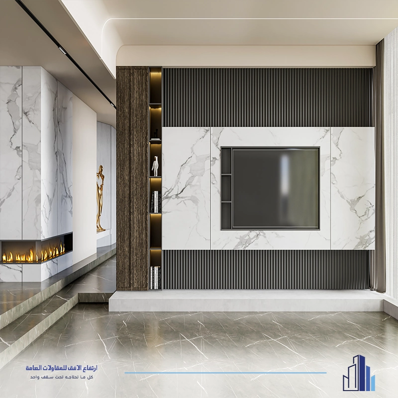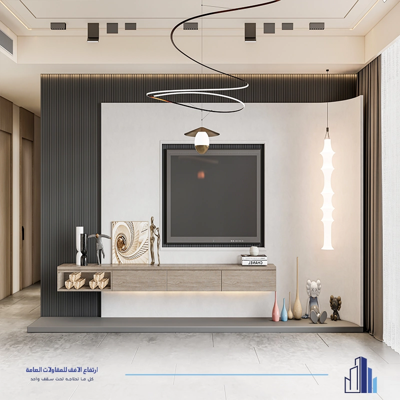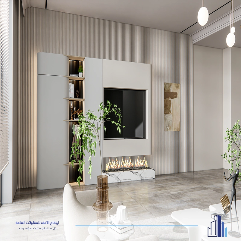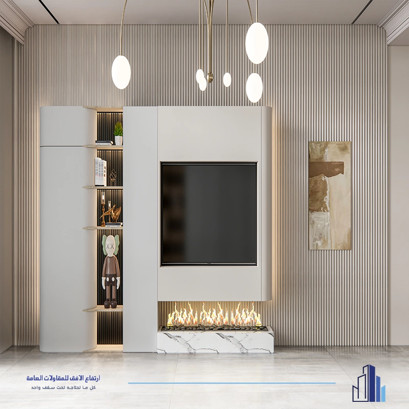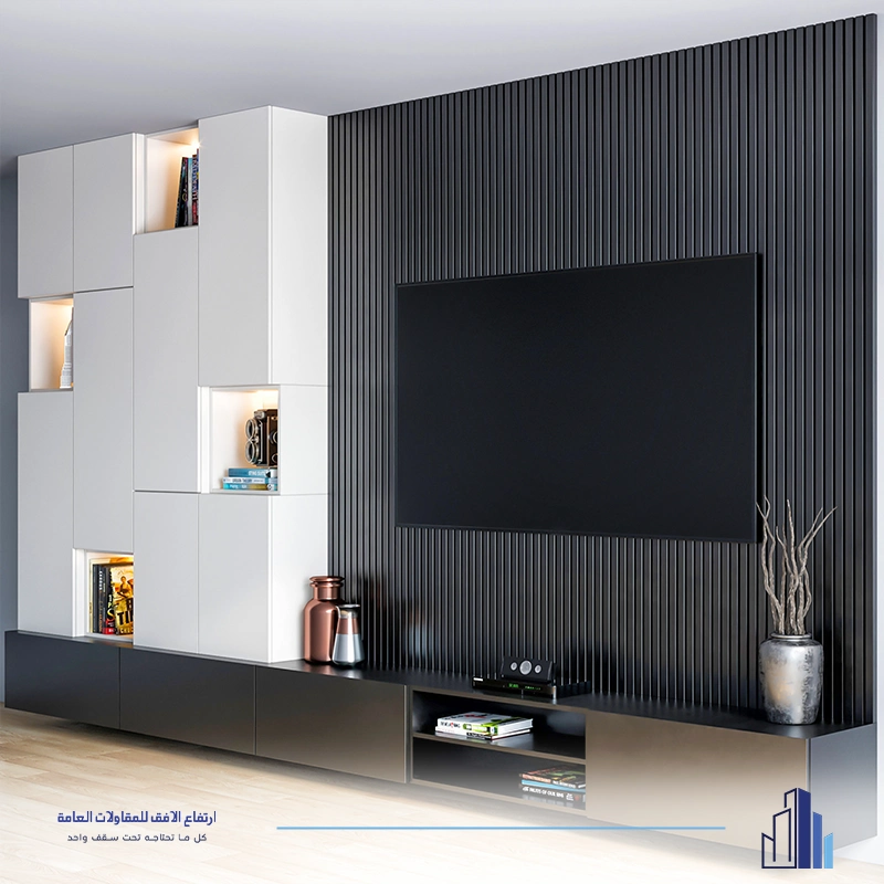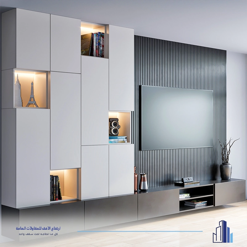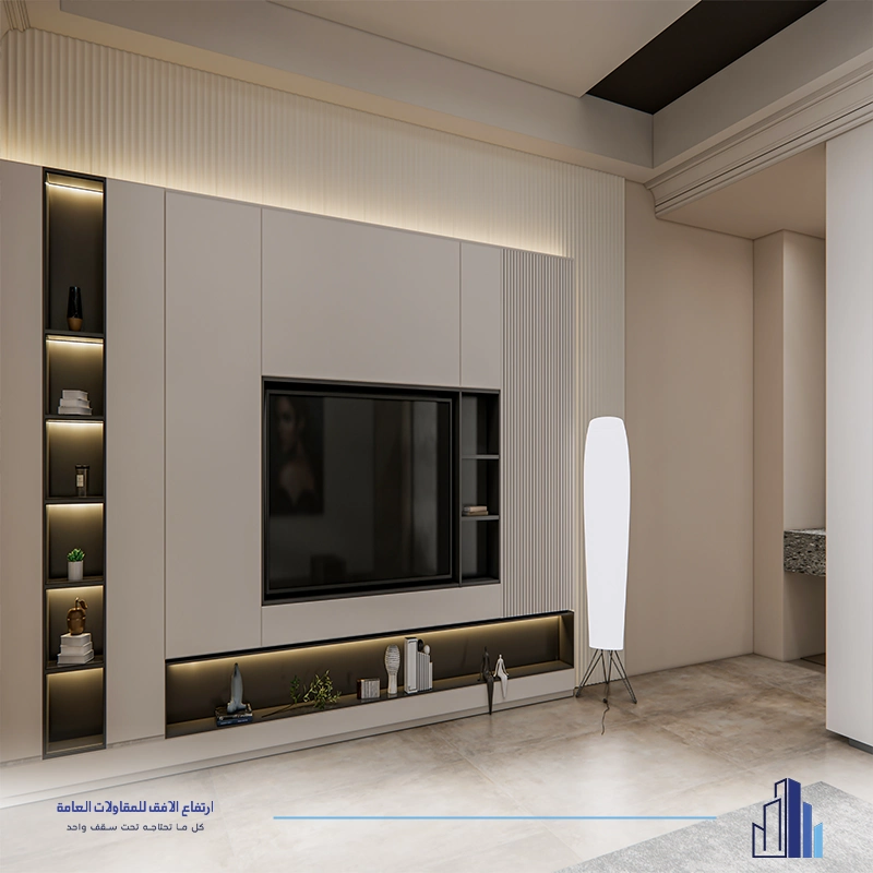 • ديكور تلفزيون مع رفوف ووحدات تخزين متكاملة.